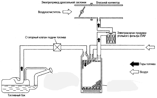 Пары бензина, образующиеся в топливном баке, попадают в сепаратор, где они конденсируются и возвращаются обратно в бак. Часть паров не успевает конденсироваться в сепараторе и через паропровод поступает в адсорбер. В фильтрующей системе эти пары поглощаются активированным углем, накапливаются и затем, при запуске двигателя, подаются во впускной коллектор.