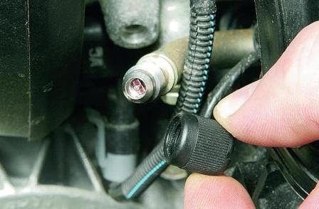 На топливной рампе найдите штуцер, предназначенный для измерения давления. С помощью колпачка от колёсного вентиля аккуратно выкрутите золотник из штуцера.