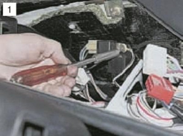 - Выполняется снятие полки в салоне под приборной панелью и корпус бардачка, далее отсоединяется жгут с разъёмом от блока.