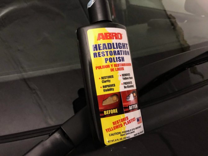 И этот состав «идеален для стекол, но может применяться и для твердого пластика, например, фонарей». Полироль в удобной упаковке, есть подробная инструкция на русском языке. А вот тереть салфеткой по фаре для удаления остатков полироля пришлось долго.
