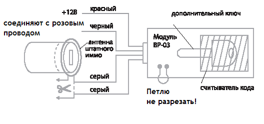 При установке сигнализации «синий» и «коричневый» шнуры разрывают, чтобы получить следующую схему: