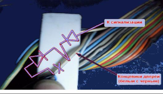 Этот жгут идет к торпедо. Нас интересует кабель концевиков дверей. В случае, если в разрыв провода вставить диод 1N5401, то ток должен идти в сторону концевиков. А второй диод 1N4001, подключается, как показано на рисунке.