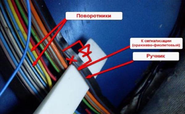 Одновременно от синих кабелей делают отводы, и протягивают шнуры к тому месту, где будет установлена сигнализация. А провод ручника разрезают, и в разрез впаивается диод 1N4001 катодом в сторону выключателя.