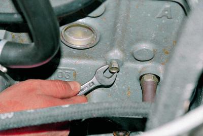 - Используя головку на 13 или ключ на 13, открутите сливную пробку с блока цилиндров.
