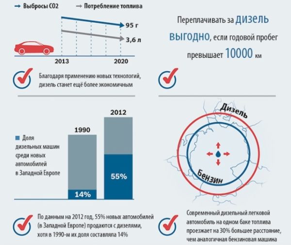Дизельные двигатели имеют два ключевых преимущества по сравнению с бензиновыми: это впечатляющая экономия топлива, достигающая 1,5 — 2 раз, и значительно больший крутящий момент, который в среднем превышает показатели бензиновых двигателей на 40 — 60%. Благодаря этим характеристикам, на обычных перекрестках можно начинать движение со второй передачи, что вполне нормально, а тяга появляется уже при оборотах, немного превышающих холостые. Кроме того, дизельные двигатели отличаются высокой надежностью и долговечностью.