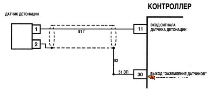 Несмотря на различия в расположении датчика в зависимости от конструкции мотора, схема его подключения остается одинаковой. Например, подключение датчика детонации на ВАЗ-2109 с инжекторным двигателем аналогично подключению на модели 2114.