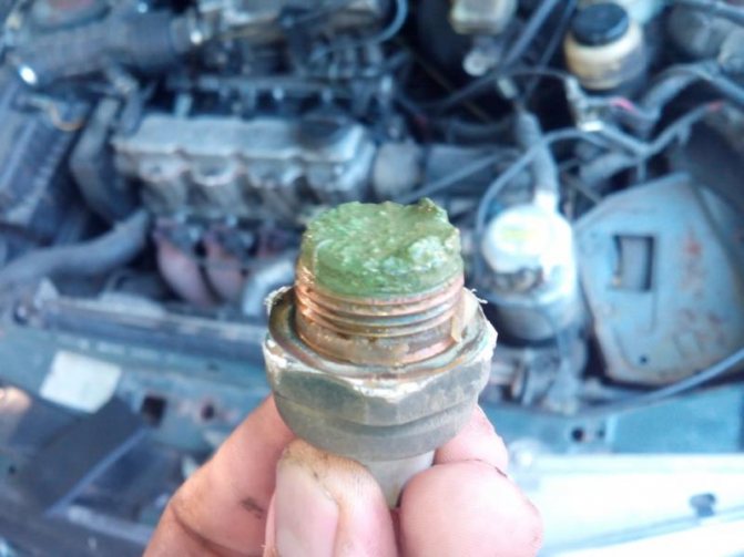- После вывинчивания устройства из посадочного отверстия потечет антифриз. Для этого под днищем следует расположить емкость для сбора. Чтобы антифриз не попал на электрические детали (в частности отсоединенный провод от датчика), следует закрыть их пленкой