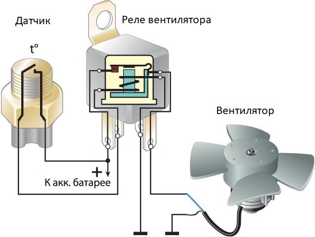 В биметаллическом датчике установлена металлическая пластина. В нормальном состоянии контакты разомкнуты. По мере нагрева пластинка деформируется и замыкает цепь, подавая управляющий сигнал на реле включения электромотора крыльчатки. Встречаются датчики, активирующие мотор вентилятора напрямую без реле. При охлаждении жидкости пластинка возвращает исходную форму, и подача тока на двигатель прекращается.