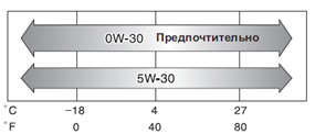 Согласно этой схеме, производитель рекомендует использовать масла с вязкостью 0w-30, так как они обеспечивают оптимальное расходование топлива и надежный запуск двигателя в условиях низких температур. Если указанное масло недоступно, можно применять жидкости с вязкостью 5w-30.