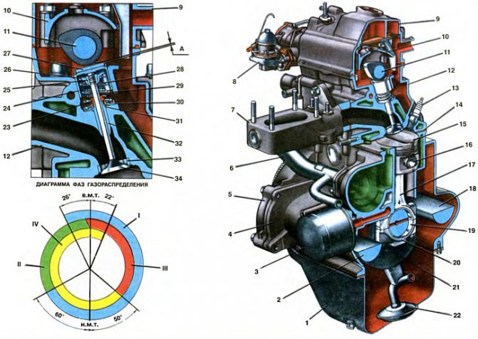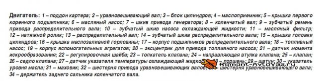 1. Масляный картер. 2. Правый уравновешивающий вал. 3. Масляный фильтр. 4. Блок цилиндров. 5. Держатель заднего сальника. 6. Подводящая труба насоса охлаждающей жидкости. 7. Впускная труба. 8. Топливный насос. 9. Крышка головки цилиндров. 10. Корпус подшипников распределительного вала. 11. Распределительный вал. 12. Головка цилиндров. 13. Свеча зажигания. 14. Прокладка головки цилиндров. 15. Поршень. 16. Поршневой палец. 17. Шатун. 18. Левый уравновешивающий вал. 19. Вкладыш шатунного подшипника коленчатого вала. 20. Крышка шатуна. 21. Коленчатый вал. 22. Приемник масляного фильтра. 23. Маслоотражательный колпачок. 24. Толкатель клапана. 25. Сухарь клапана. 28. Тарелка пружины клапана. 27. Регулировочная шайба. 28. Внутренняя пружина клапана. 29. Наружная пружина клапана. 30. Опорная шайба пружин. 31. Стопорное кольцо. 32. Направляющая втулка клапана. 33. Седло клапана. 34. Впускной клапан.