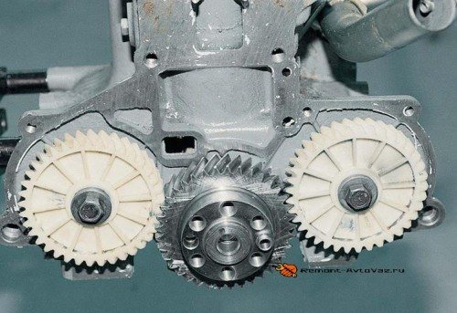 Примечательно, что шестерни изготовлены не из металла, а из текстолита или пластика. Поскольку особой нагрузки при работе эти шестерни не испытывают, то особая прочность им не требуется. К тому же использование текстолита и пластика позволило снизить общий вес силового агрегата.