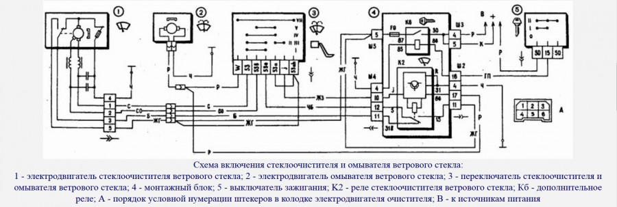 - Электрическая часть системы включает в себя переключатель (расположенный под рулем), реле для активации прерывистого режима, дополнительное реле и выключатель. Все элементы электросистемы соединены проводами (в колодках) через термический биметаллический предохранитель. При этом как реле, так и предохранитель F5 находятся в монтажной части, а биметаллический предохранитель с концевым выключателем размещен в редукторе электромотора;
