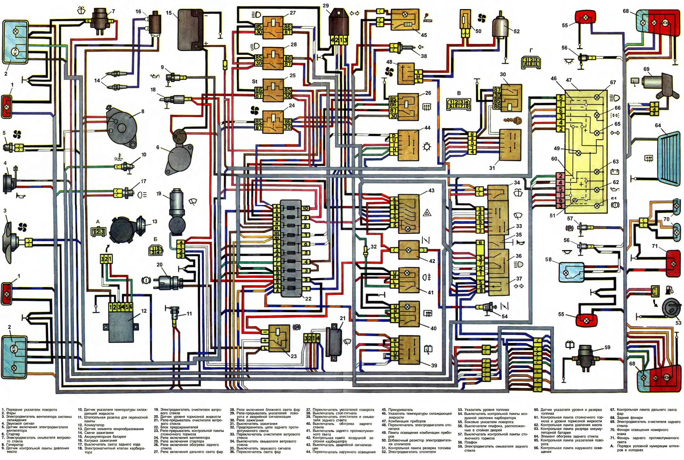 Цепи питания тех узлов электрооборудования, которые могут понадобиться в любых условиях, всегда подключены к аккумулятору и генератору, независимо от положения ключа в выключателе зажигания. К таким узлам относятся звуковой сигнал 4, прикуриватель 45, нити ламп тормозного сигнала в задних фонарях 68, фонари 70 освещения номерного знака, плафон 58 освещения салона и штепсельная розетка 11 для переносной лампы. Также напрямую подключены цепи аварийной сигнализации, габаритного света и сигнализации дальнего света фар.