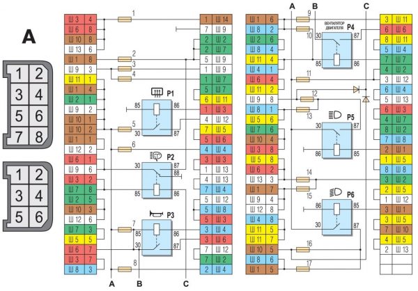 - Цифры под буквой А указывают на номер штекера в колодках монтажного блока;