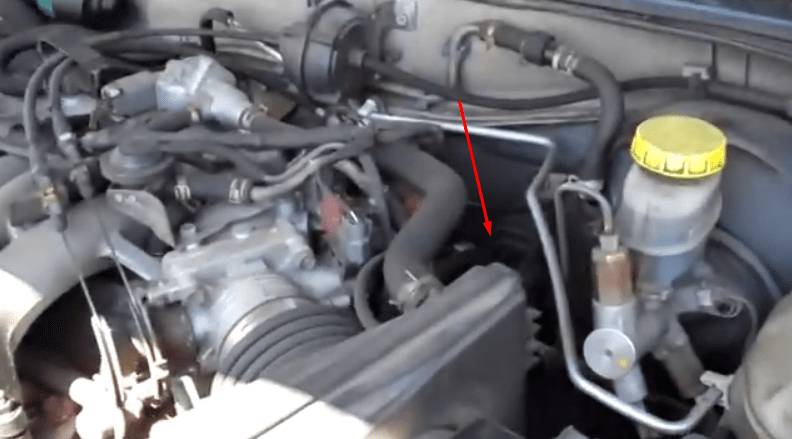 Сначала необходимо извлечь предохранитель топливного насоса, чтобы сбросить давление в топливной системе. Затем определим местоположение топливного фильтра, которое указано на фотографии стрелкой.