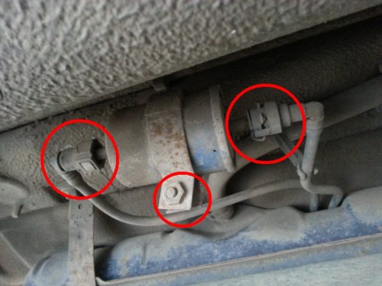 - После этого спускаемся под автомобиль, и ключами «17» и «19» ослабляем затяжку наконечников трубок к фильтру, фото ниже