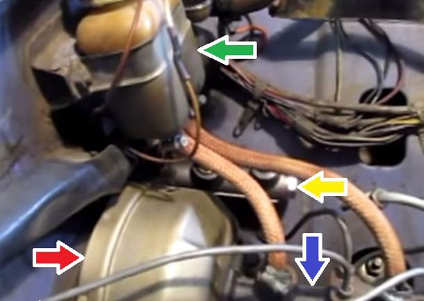 На изображении подкапотного пространства автомобиля, выделенное жёлтой стрелкой, находится устройство. Рядом с ним расположен вакуумный усилитель тормозов, обозначенный красной стрелкой, а также главный тормозной цилиндр, который отмечен синей стрелкой. Над главным цилиндром располагаются несколько бачков, среди которых один — бачок гидропривода тормозов, указанный зелёной стрелкой.