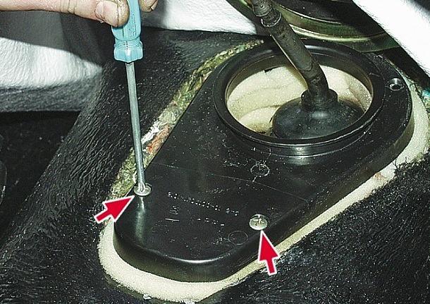 - Снимите пластиковую накладку, находящуюся под напольным покрытием. Для этого придется демонтировать сиденья и их направляющие. Проще сделать разрез в сторону задних сидений, что позволит избежать полной разборки салона. Обеспечив доступ к накладке, выкрутите 4 самореза, крепящие ее, и снимите. Переключите коробку на 1-ю передачу;
