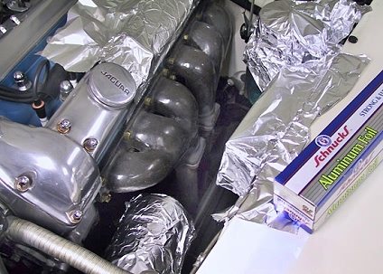 - Перед мойкой двигателя нужно закрыть все датчики, реле и другие устройства, для которых не желательно попадание воды. Для этого прекрасно подойдёт алюминиевая фольга. Она маскирует элементы двигателя и хорошо держится на своём месте. Фольга принимает форму, обёрнутых ей деталей, и не мешает при чистке двигателя.