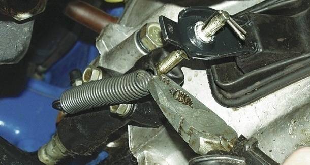 - Отсоедините оттяжную пружину с помощью пассатижей.