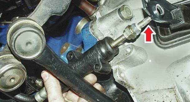 - Извлеките толкатель из вилки, возьмите рабочий цилиндр в руку и с помощью ключа на 17 полностью открутите гайку наконечника, сняв шланг.