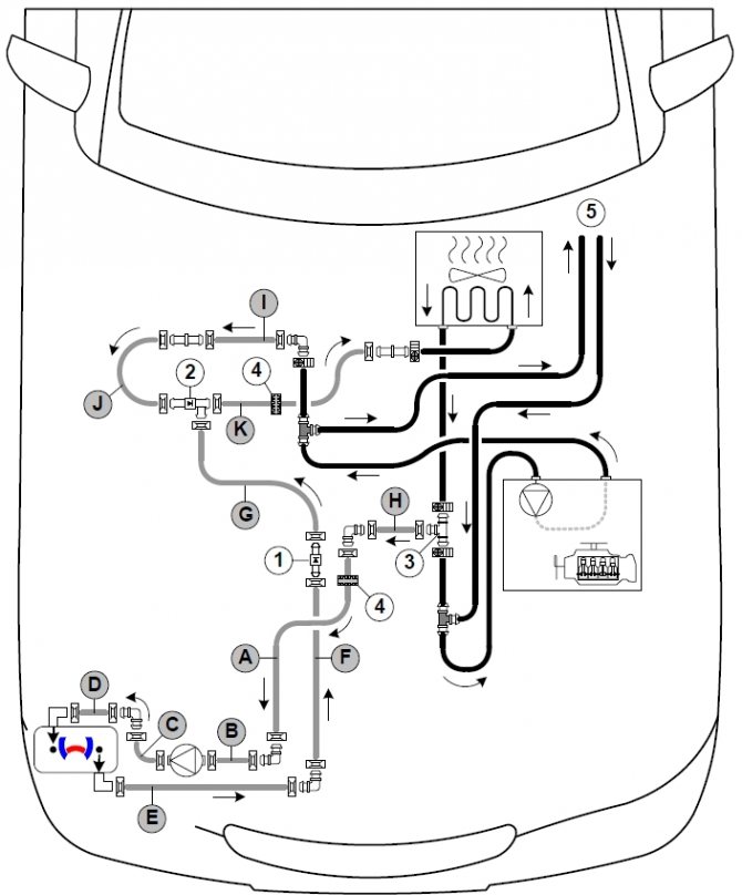 - Активируется циркуляционный насос, благодаря которому подогретая жидкость поступает к мотору. Она нагревает и непосредственно двигатель, и радиатор, обслуживающий салон.