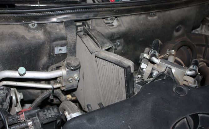 Если у вас автомобиль оборудован кондиционером panasonic или halla салонный фильтр расположен вертикально, за двигателем. Чтобы до него добраться необходимо открутить несколько болтов шумоизоляции капота.
