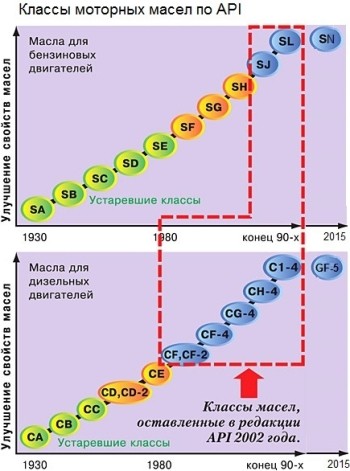Эти буквы не используются отдельно; они всегда сопровождаются дополнительным символом латинского алфавита (например, SG). Чем дальше этот символ находится в алфавите, тем выше качество масла. Универсальные масла, которые чаще всего встречаются в синтетическом классе, обозначаются через «/». Например: SG/CD.