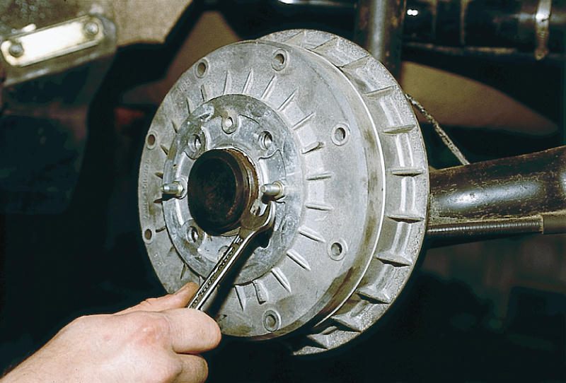 Отогнуть стопорную пластину, чтобы получить доступ к болту, и открутить его, используя ключи «на 17» внутри и «на 13» сверху.