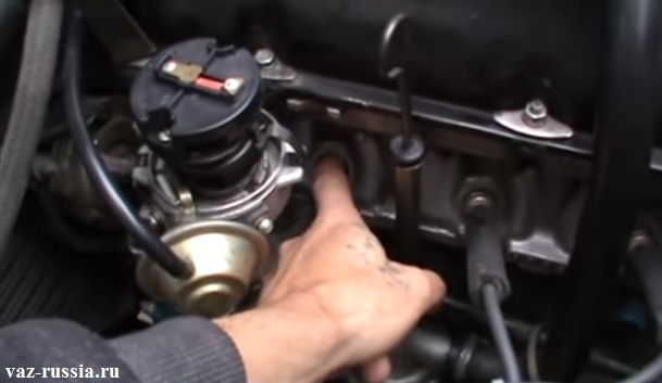 Далее вам нужно открутить нижнюю гайку трамблера (не отворачивайте её полностью, оставьте немного на резьбе). Затем слегка приподнимите трамблер и поверните его валик, перемещая ротор трамблера (ротор находится в верхней части, на него направлена синяя стрелка). Вам нужно вращать ротор до тех пор, пока он не будет направлен на первый цилиндр (смотрите по крышке трамблера). После этого опустите трамблер и затяните гайку, но не до конца.