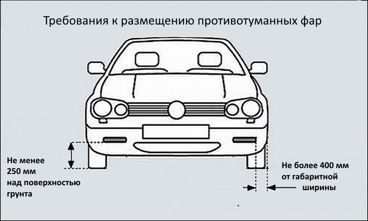 - места для установки противотуманок должны находиться ниже верхней границы гнезда фары ближнего света;