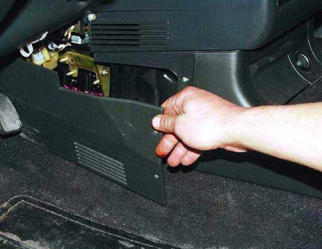 - Для доступа к механизму, с обеих сторон приборного туннеля откручиваются по два болта, после чего снимаются облицовочные панели слева и справа.