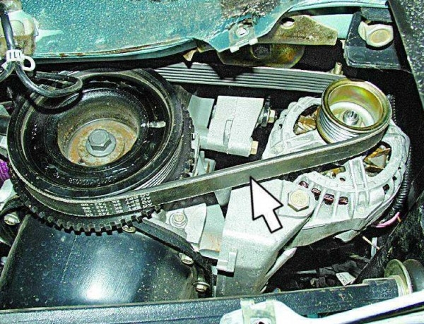 - Переместите генератор в сторону двигателя, чтобы освободить доступ к ремню и снять его со шкивов коленчатого вала и генератора.
