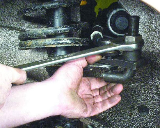 - Зафиксировав положение муфты ключом на «24», откручивается контргайка ключом на «27» (вращая по часовой стрелке). Часто она может быть сильно затянута (возможно, заржавела или прикипела). Чтобы облегчить откручивание, рекомендуется нанести на гайку тормозную жидкость или средство WD-40. Можно также аккуратно постучать по гайке молотком;