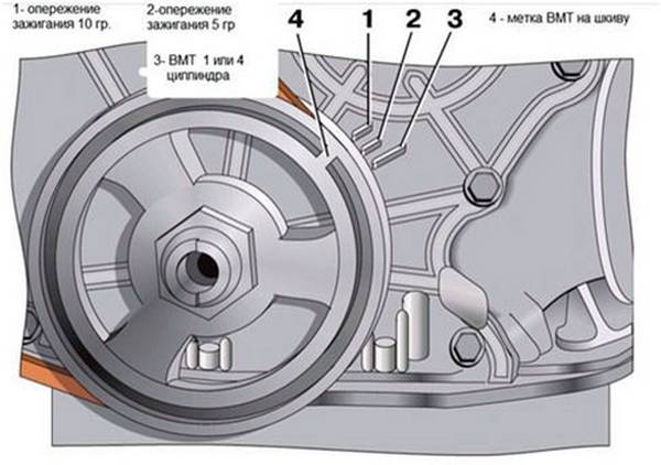 - насечка на шкиве коленчатого вала стоит напротив длинной риски, нанесённой на крышке газораспределительного механизма;