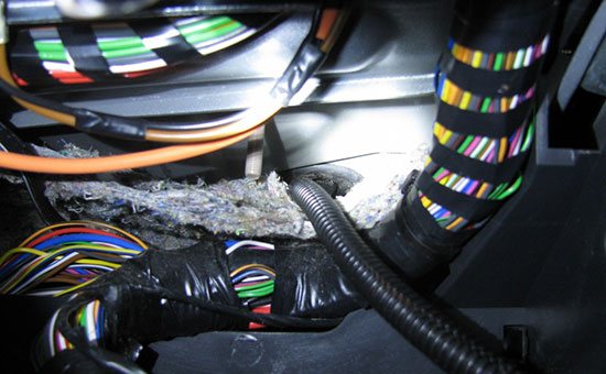 - Провода необходимо протянуть в салон в районе ГТЦ, для этого достаем специальную заглушку, под которой скрываются необходимые нам отверстия. Для удобства рекомендуется снять жабо вместе с дворниками, а также расширительный бачок с кронштейном.