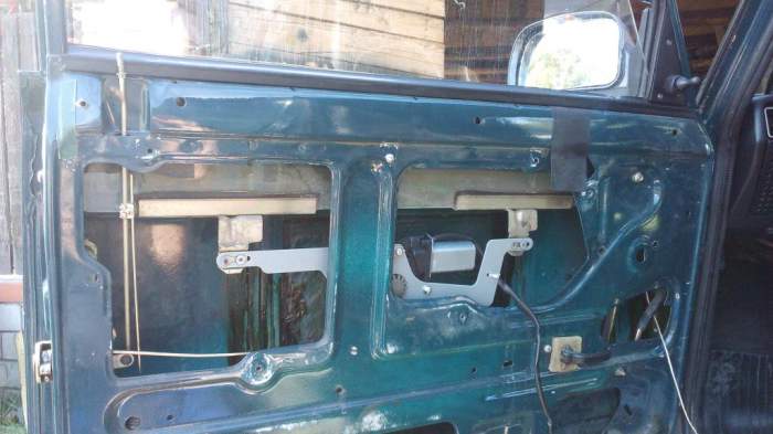 Теперь в верхнее отверстие вставляет механизм стеклоподъемника (в сложенном виде). Обычно он фиксируется гайками М6 и стопорными шайбами. В отверстие посередине ставится винт. Во время затяжки все гайки должны быть полностью закручены , так как при движении автомобиля крепления могут ослабнуть.