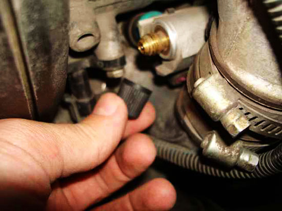 - В моторном отсеке на топливной рампе двигателя найдите штуцер для измерения давления (он расположен на правом торце).
