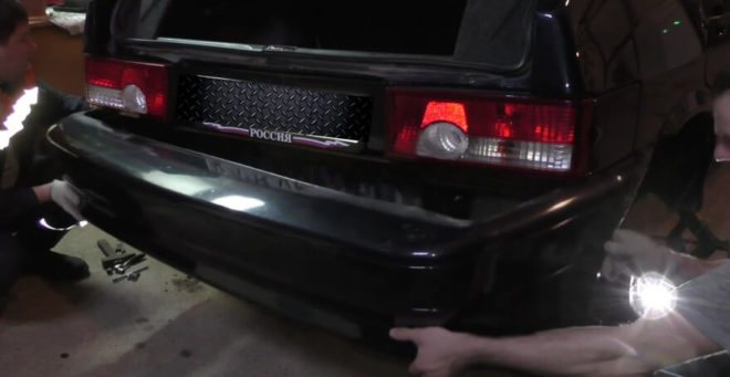- Затем нужно удалить шумоизоляционное покрытие в багажном отделении и установить пластины в прямоугольные отверстия лонжеронов, к которым уже приварены крепежные элементы. Расширение отверстий также выполняется с помощью дрели.