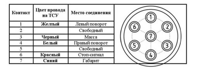 После установки фаркопа можно переходить к подключению розетки с проводами, которые обеспечивают электрическую связь с прицепом. Расположение контактов имеет следующий вид: