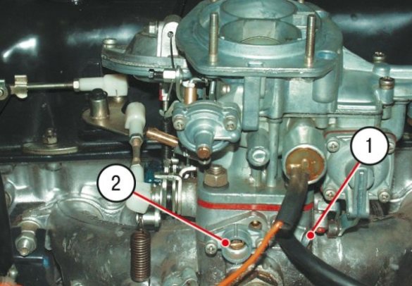 Винт 1 регулирует количество подаваемого бензина, винт 2 регулирует положение дроссельной заслонки