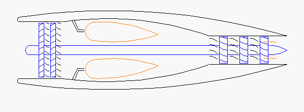 Турбовентиляторный двигатель — это что вроде компромисса между турбореактивным и турбовинтовым. Он работает как турбореактивный, но есть одна особенность: турбинный вал вращает внешний вентялятор, который имеет больше лопастей и крутится быстрее пропеллера. Это помогает данному двигателю оставаться эффективным на больших высотах, где воздух рязряжен.