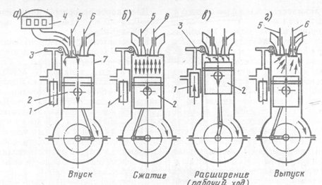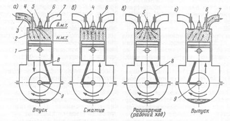 а — такт впуска; б — такт сжатия; в — такт расширения (рабочий ход); г — такт выпуска; 1 — поршень; 2 — цилиндр; 3 — газопровод; 4 — впускной клапан; 5 — свеча зажигания; 6 — выпускной клапан; 7— газопровод; 8 — шатун; 9 — коленчатый вал.