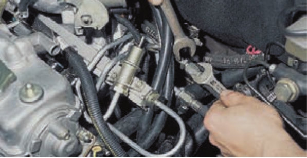 - Ослабьте соединения подачи и слива бензина, сбросьте давление. Открутите топливные трубопроводы, запомнив их расположение.