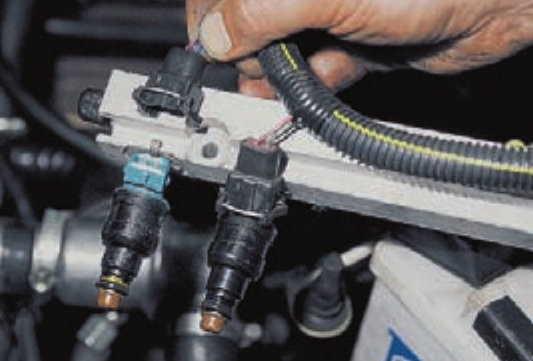 Выключите зажигание. Отсоедините разъёмы питания от форсунок.