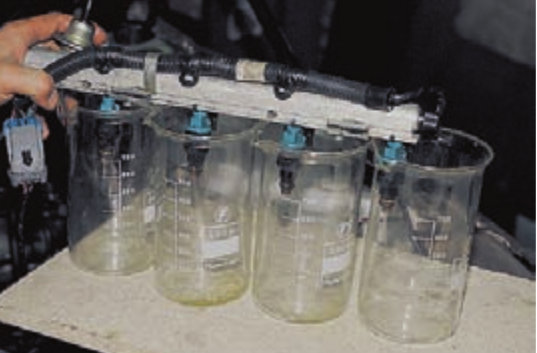 Проверьте работу распылителей. Образование облака у всех форсунок должно быть схожим. Объём топлива в мерных ёмкостях не должен значительно различаться. Существенные расхождения могут указывать на загрязнение и изменение производительности. Форсунки, закоксованные смолистыми отложениями или забитые, требуют очистки. Полное отсутствие топлива на выходе сопла свидетельствует о неисправности клапана и необходимости его замены.