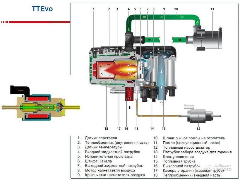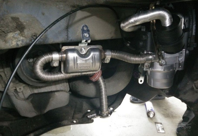 Устройство жидкостного подогревателя более сложное. Он подключается к системе охлаждения двигателя. Обогреватели с насосом для подачи топлива получают горючее по отдельной линии. Топливо попадает в камеру, где происходит его сгорание.