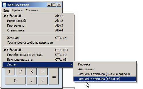 Чтобы избежать ручных расчетов, можно использовать стандартный калькулятор, который есть в операционных системах Windows 7, 8 и 10. Для этого в меню «Вид» калькулятора выберите раздел «Листы» и нажмите на пункт «Экономия топлива (л/100 км)»: