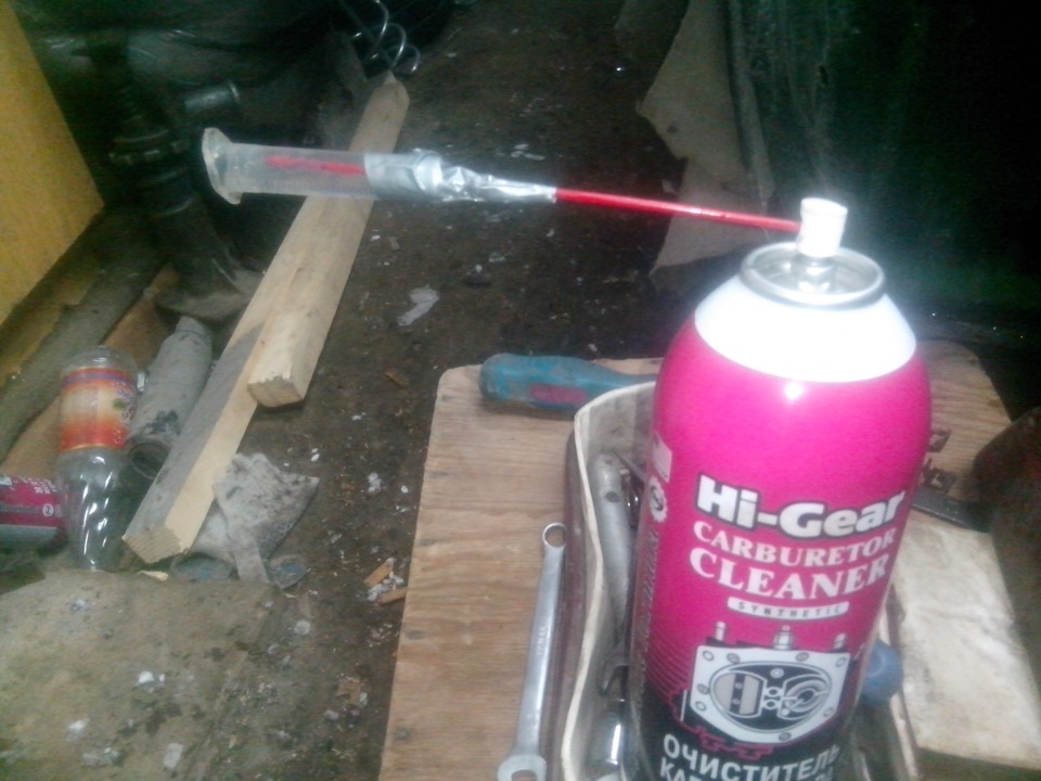 | 2. Используйте очиститель. | Распылите очиститель карбюратора/форсунок на распылитель форсунки и в ее входное отверстие. | |