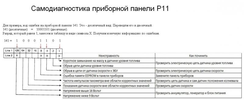На ранних моделях автомобилей Ниссан, таких как Примера P11, для интерпретации ошибки, отображаемой на комбинации приборов, необходимо преобразовать её в двоичный код, который поможет определить тип неисправности. Ниже представлен пример расшифровки кода ошибки Nissan с кодом 141.